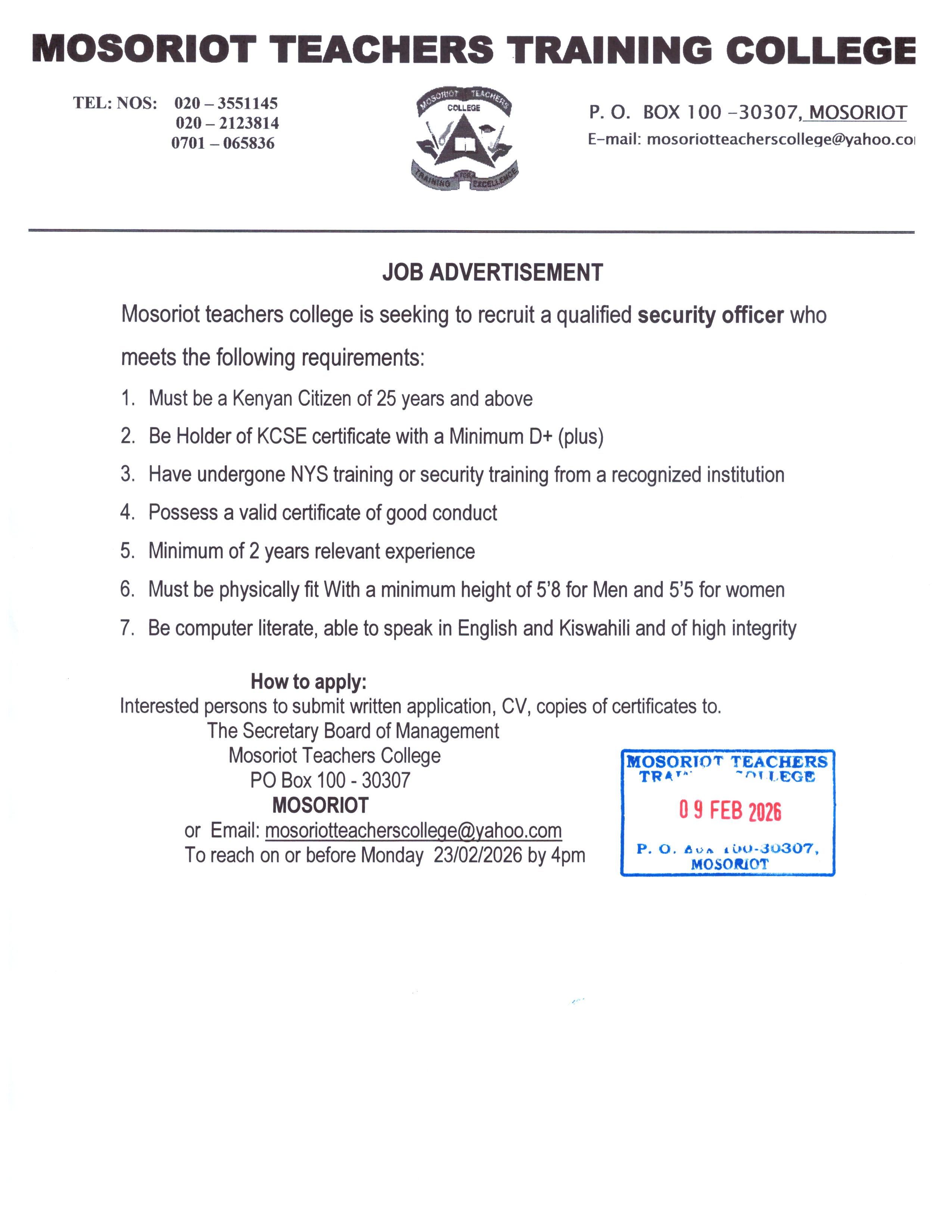 MOSORIOT TEACHERS' COLLEGE CAREERS 2025